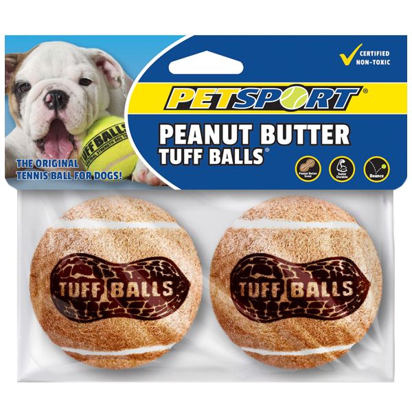Peanut butter balls are heavy duty tennis balls made specially for dogs and flavored with natural peanut and other flavorings that taste great and neutralize doggie breath. They are non-toxic and colorfast. Made with a special felt that is less abrasive. This helps prevent dogs from wearing down their teeth while playing fetch. Pack includes a pair of 2.5" diameter balls. Shipping weight: 2/5 lb.