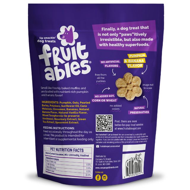 Pumpkin, Oats, Pearled Barley, Potatoes, Sunflower Oil, Cane Molasses, Cinnamon, Bananas, Natural Banana Flavor, Natural Vanilla Flavor, Mixed Tocopherols (to preserve freshness), Rosemary Extract, Green Tea Extract, Spearmint Extract.