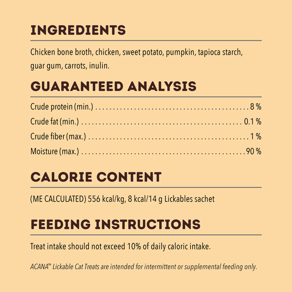 ACANA Lickables Chicken Cat Treats are crafted with protein-rich animal ingredients and hydrating bone broth for a creamy smooth texture cats crave. Tempt your cat to come closer and purr with enjoyment as they bond with you and experience a burst of flavor. They're perfect for hand feeding from the pouch without a mess or squeezed over kibbles as a tasty topper. Product of Thailand.