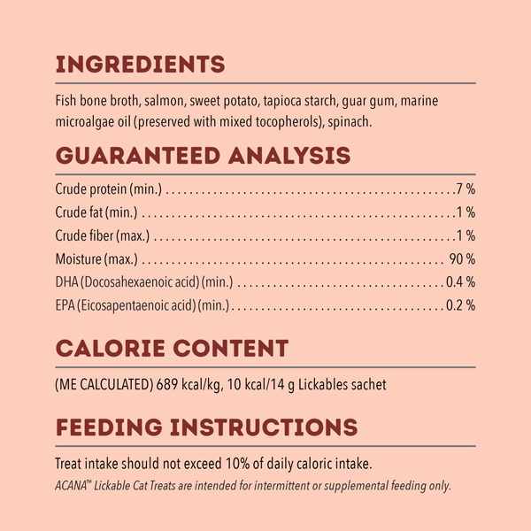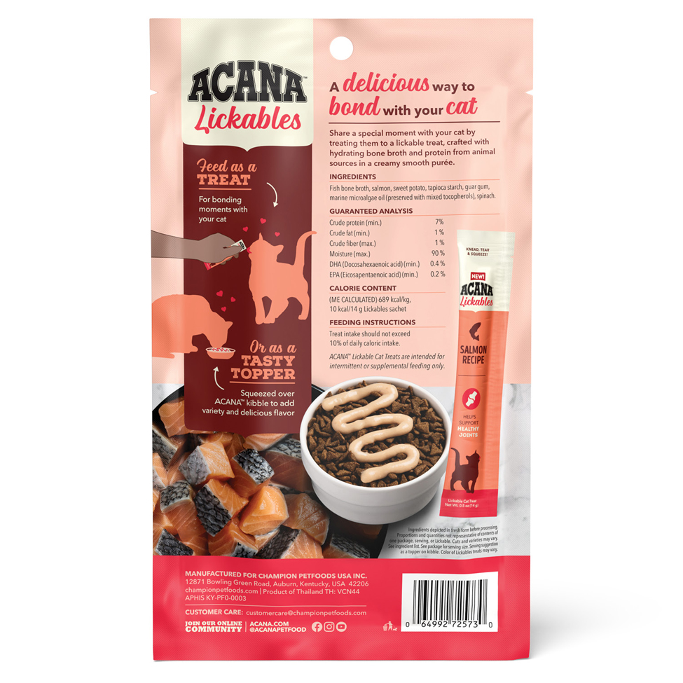 ACANA Lickables Salmon Cat Treats are crafted with protein-rich animal ingredients and hydrating bone broth for a creamy smooth texture cats crave. Tempt your cat to come closer and purr with enjoyment as they bond with you and experience a burst of flavor. They're perfect for hand feeding from the pouch without a mess or squeezed over kibbles as a tasty topper. Product of Thailand.
