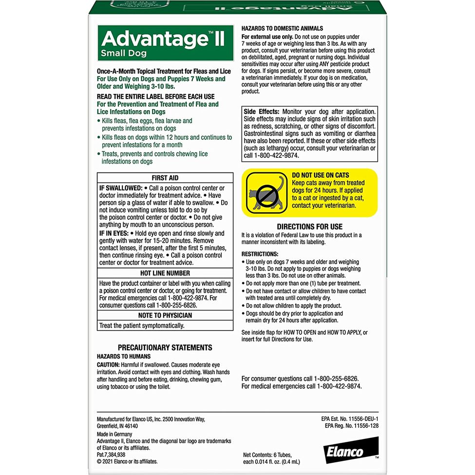 Advantage II Flea Control for Small Dogs is an effective and convenient once-a-month topical flea treatment for dogs 7 weeks and older, weighing 3 to 10 pounds. It kills 98-100% of the fleas on dogs within 12 hours. Advantage II 3-way flea protection kills adult fleas, larvae and eggs. Contains (6) doses; each dose provides protection for 30 days.