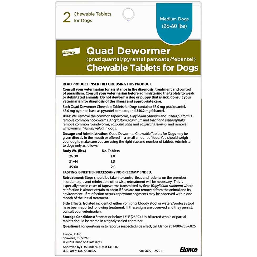 Elanco Quad Dewormer Tablets for Dogs remove whipworms, tapeworms, hookworms and roundworms in medium dogs and puppies over 3 weeks of age weighing 26 to 60 pounds.