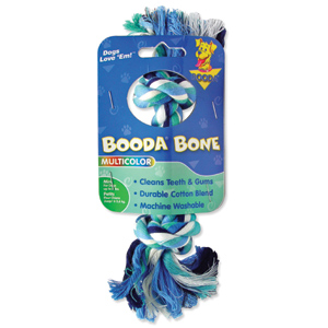 This Booda Rope Bone is made of a multi-colored cotton blend. Rope bones are great for dental hygiene because the cotton fibers vigorously brush teeth and massage gums when dogs chew them. It is cleaner and tougher than rawhides. Great for dogs and puppies up to 8 pounds.
