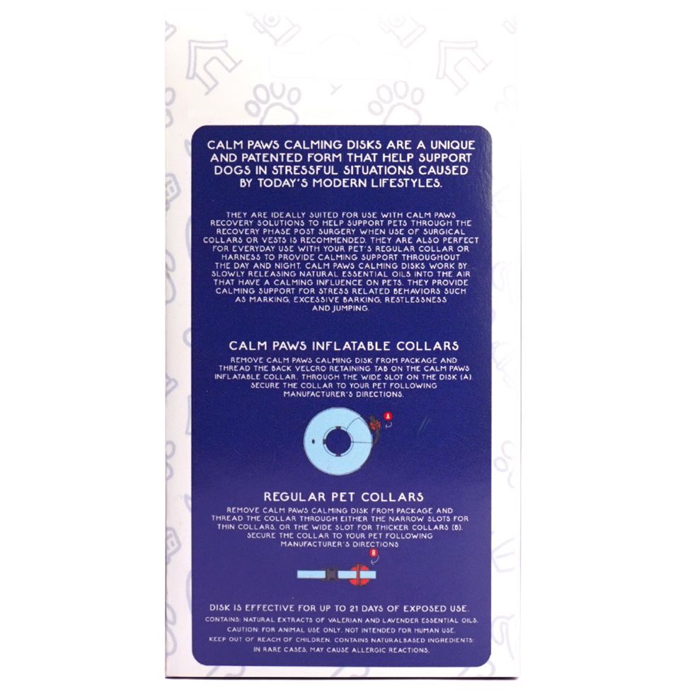 Calm Paws Calming Disk Dog Collar Attachment contains a natural blend of essential oils that provide calming support for stress-related behaviors such as urine marking, excessive barking, restlessness and jumping. Simply attach the disk onto your dog's collar, harness, or use with Calm Paws Inflatable Protective Collar to help calm your dog throughout the day and night.