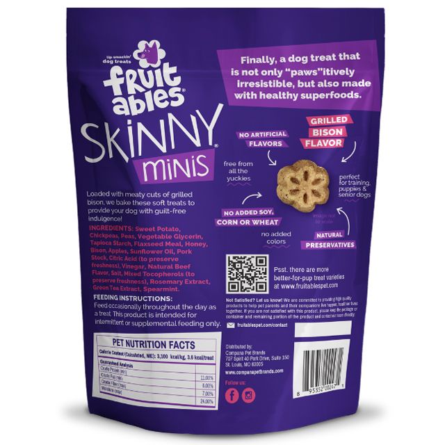 Sweet Potato, Chickpeas, Peas, Vegetable Glycerin, Tapioca Starch, Flaxseed Meal, Honey, Bison, Apples, Sunflower Oil, Pork Stock, Citric Acid (to preserve freshness), Vinegar, Natural Beef Flavor, Salt, Mixed Tocopherols (to preserve freshness), Rosemary Extract, Green Tea Extract, Spearmint.