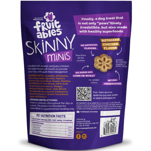 Pumpkin, Chickpeas, Peas, Vegetable Glycerin, Tapioca Starch, Flaxseed Meal, Honey, Chicken, Sunflower Oil, Pork Stock, Citric Acid (to preserve freshness), Vinegar, Natural Chicken Flavor, Salt, Mixed Tocopherols (to preserve freshness), Rosemary Extract, Green Tea Extract, Spearmint Extract.