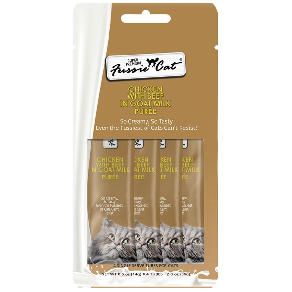 Fussie Cat Goat Milk Puree Cat Treats is made with a blend of real chicken and beef, along with Goat Milk, which is naturally nutrient-rich and easy to absorb - perfect for picky eaters and sensitive stomachs. Goat Milk provides essential vitamins, minerals and healthy fats that may help support digestion, energy and everyday wellness. Made in Thailand. Contains (4) 0.5 oz tubes.