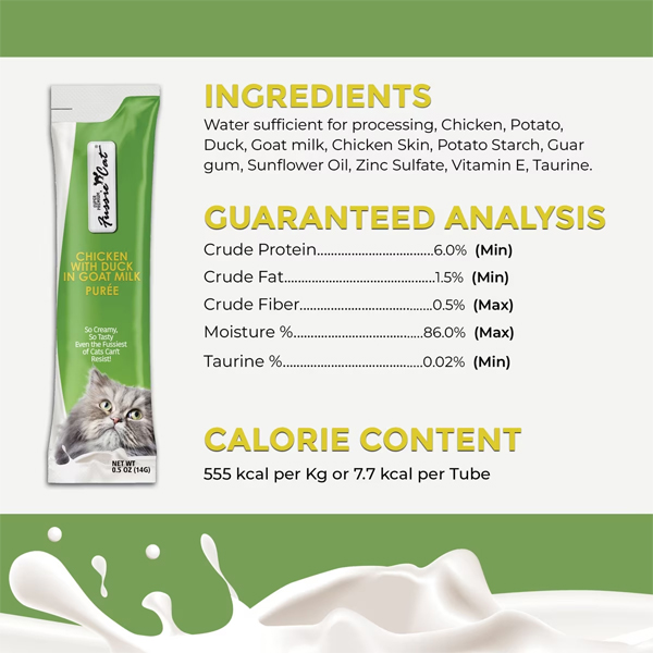 Fussie Cat Goat Milk Puree Cat Treats is made with a blend of real chicken and duck, along with Goat Milk, which is naturally nutrient-rich and easy to absorb - perfect for picky eaters and sensitive stomachs. Goat Milk provides essential vitamins, minerals and healthy fats that may help support digestion, energy and everyday wellness. Made in Thailand. Contains (4) 0.5 oz tubes.