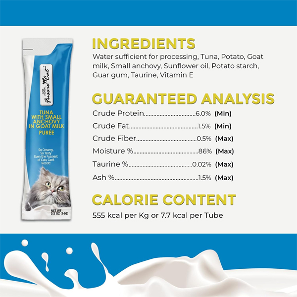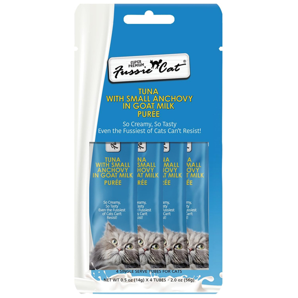 Fussie Cat Goat Milk Puree Cat Treats is made with a blend of real tuna and small anchovies, along with Goat Milk, which is naturally nutrient-rich and easy to absorb - perfect for picky eaters and sensitive stomachs. Goat Milk provides essential vitamins, minerals and healthy fats that may help support digestion, energy and everyday wellness. Made in Thailand. Contains (4) 0.5 oz tubes.