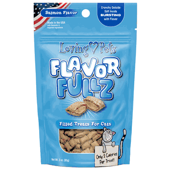 Loving Pets Flavorfullz Salmon Filled Cat Treats are crunchy on the outside with a soft center that's bursting with Chicken flavor. At only 2 calories per treat, they're the perfect guilt-free treat for cats of all sizes. Listen to your kitty purr while you get more bang for your buck. Made in USA.