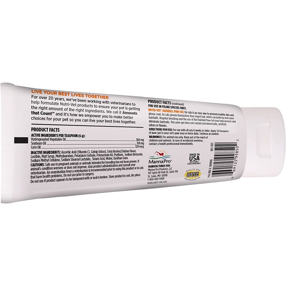 Nutri-Vet Hairball Paw Gel for Cats contain natural oils and lubricants that help prevent hairballs in a tasty, easy to feed chicken flavor gel. Feed to prevent hairballs by minimizing excessive shedding, while promoting skin and coat health. For use with cats 6 weeks and older. Made in USA.