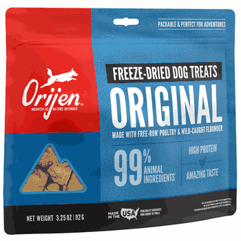 ORIJEN Freeze Dried Original Dog Treats are packed with animal proteins from Free-Run Poultry and Wild Caught Flounder. Delicious and nutritious, they are gently freeze-dried, concentrating their natural flavors into a treat your dog will love. Made in USA.