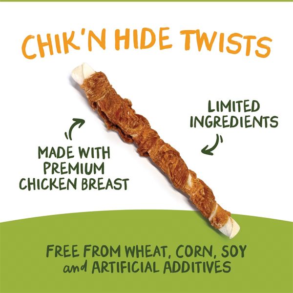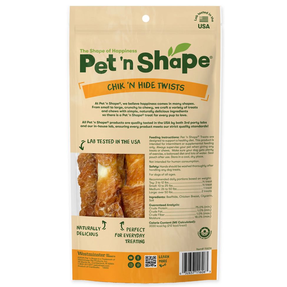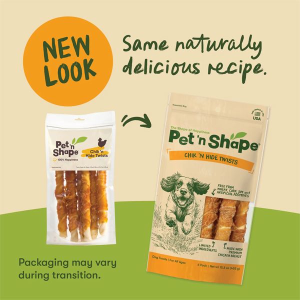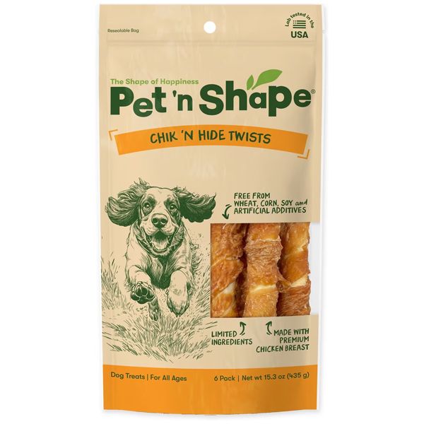 Pet 'n Shape Chicken Hide Twists for dogs are long-lasting chews made with all natural chicken breast delicately wrapped around a savory rawhide stick. Each twist provides your dog with a high protein, healthy snack. Product of Cambodia.