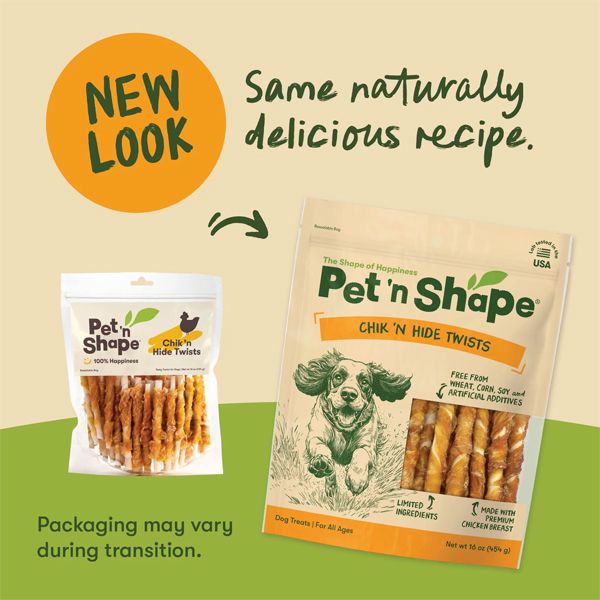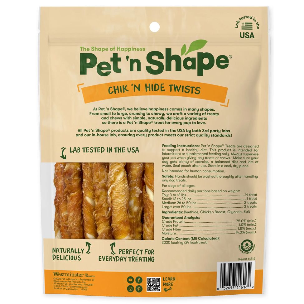 Pet 'n Shape Chicken Hide Twists for dogs are long-lasting chews made with all natural chicken breast delicately wrapped around a savory rawhide stick. Each twist provides your dog with a high protein, healthy snack. Product of Cambodia. Contains up to 50 twists.