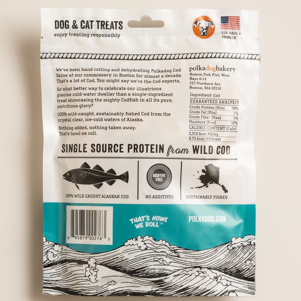 Polkadog Alaskan Cod Chips Dog and Cat Treats are crafted from 100% wild caught, sustainably fished Cod from the pure, ice cold waters of Alaska. These single ingredient, light and crunchy chips have been slowly dehydrated and naturally packed with nutrients and omega fatty acids making them a healthy and delicious treat your dog will love. Sourced and made in USA.
