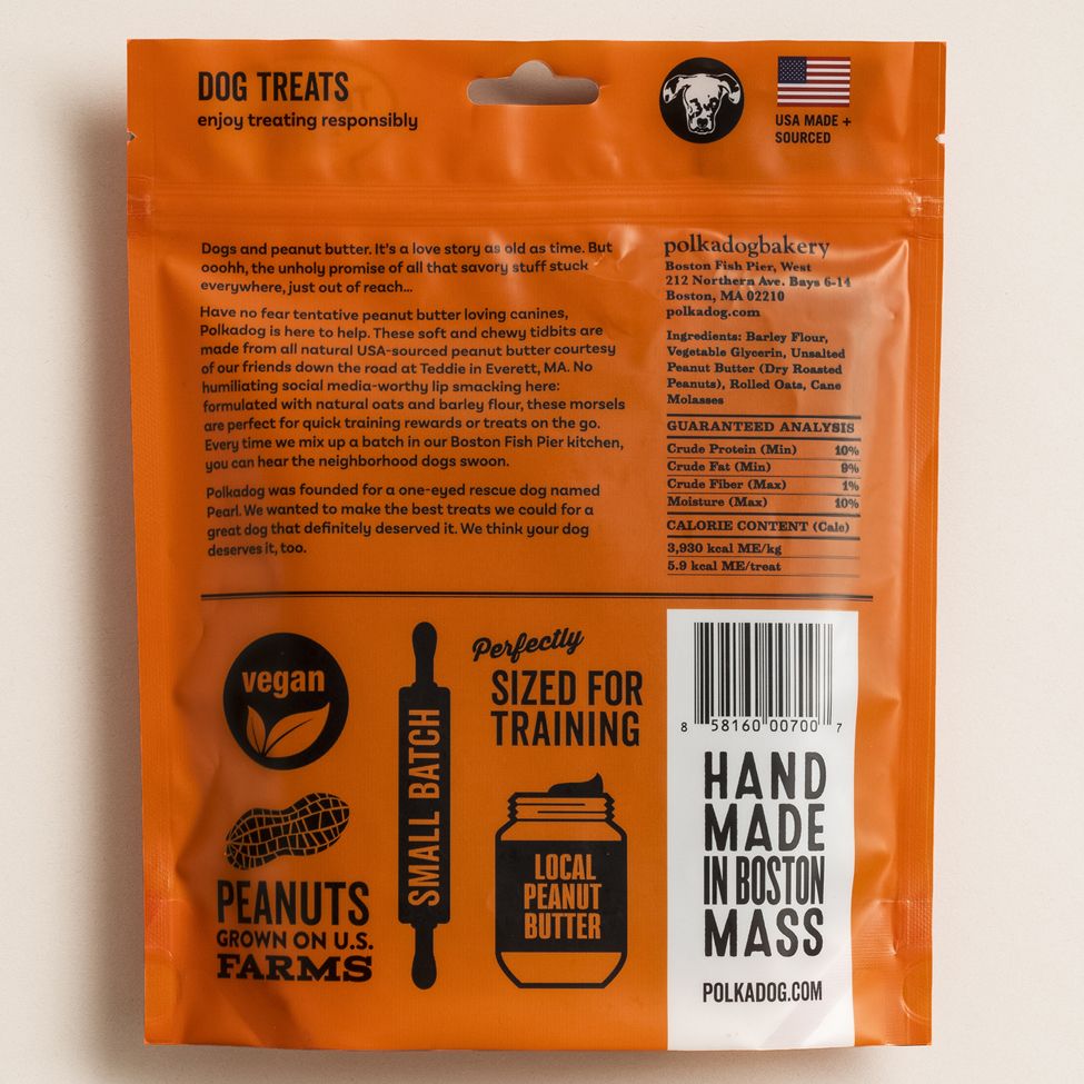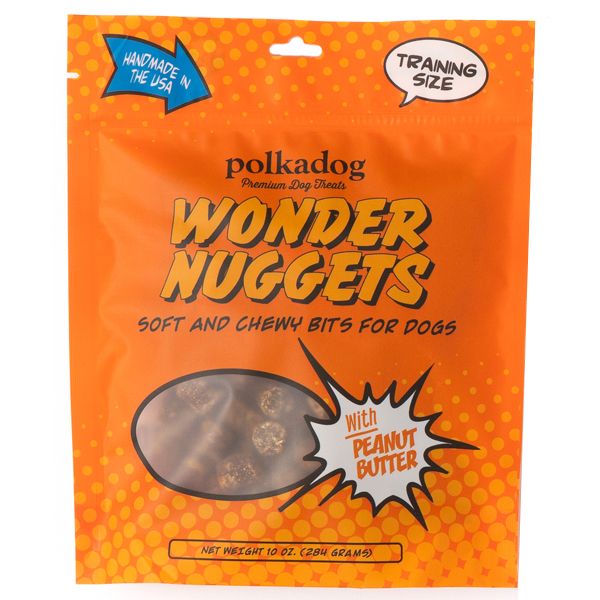 Polkadog Wonder Nuggets with Peanut Butter Dog Treats are soft and chewy bites made with all natural peanut butter, oats and barley flour into the perfect size for training. Sourced and made in USA.