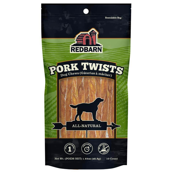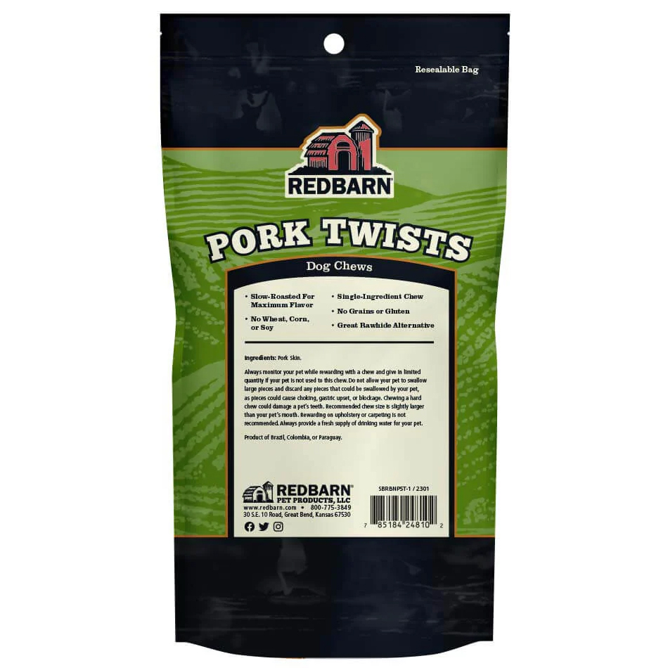 Redbarn Pork Twists Dog Treats are single ingredient chews made from 100% all natural pork skin that has been slow roasted for maximum flavor and taste. Highly palatable and 100% digestible, they are the perfect rawhide alternative for light to medium chewers. Product of Colombia, Brazil or Paraguay.