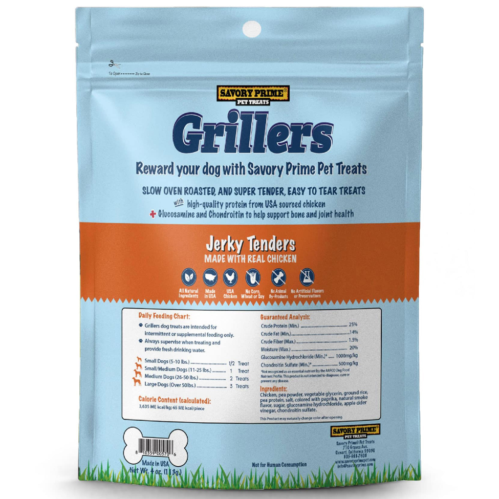 Savory Prime Grillers Chicken Jerky Tenders Dog Treats are made with high quality protein from USA-sourced Chicken along with Glucosamine and Chondroitin to help support bone and joint health. Slow oven-roasted and super tender, these tasty chicken treats will satisfy your dog's cravings. Made in USA.