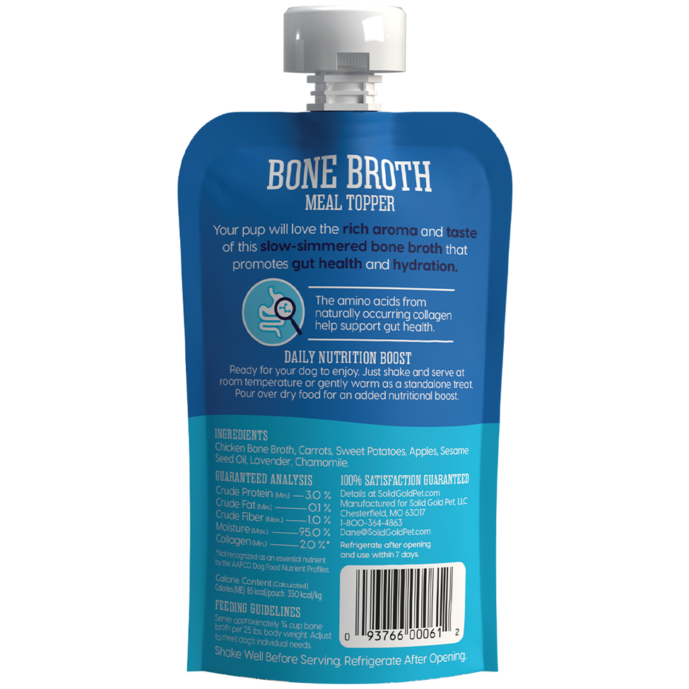 Solid Gold Chicken Bone Broth with Lavender and Chamomile Dog Food Topper adds nutrient, aroma and delicious flavor to your pup's meals. This tasty topper is made with human grade chicken bone broth and is rich in naturally occurring collagen, as well as vitamins and minerals for overall wellness. Simply add 2 tablespoons to your dog's food as a tasty topper, use to moisten dry food for dogs with sensitive teeth, or add to his water for added flavor and encourage proper hydration. Made in USA.