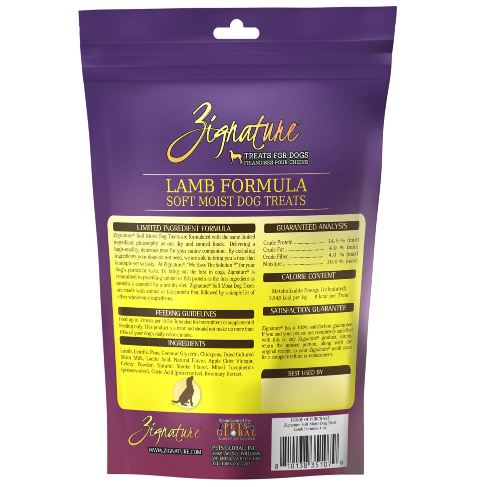 Zignature Lamb Soft Moist Dog Treats are made with high quality lamb and fiber-rich ingredients like lentils and chickpeas. Formulated with a limited ingredient recipe, they are simple, yet tasty and delicious. These soft and chewy bite-sized treats are perfect as a snack or training reward.