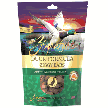 Zignature Ziggy Bars Dog Treats are limited ingredient biscuits made with duck and fiber-rich ingredients like pumpkin, lentils, and garbanzo beans for a simple, yet tasty treat your dog will love. These high quality, well-balanced bite sized treats are perfect as a snack or training reward.